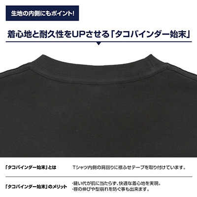 ・Tシャツ内側の肩まわりには、襟伏せテープを取り付ける「タコバインダー始末」を採用。襟の伸びや型崩れを防ぎ、より快適な着心地を追求しました。