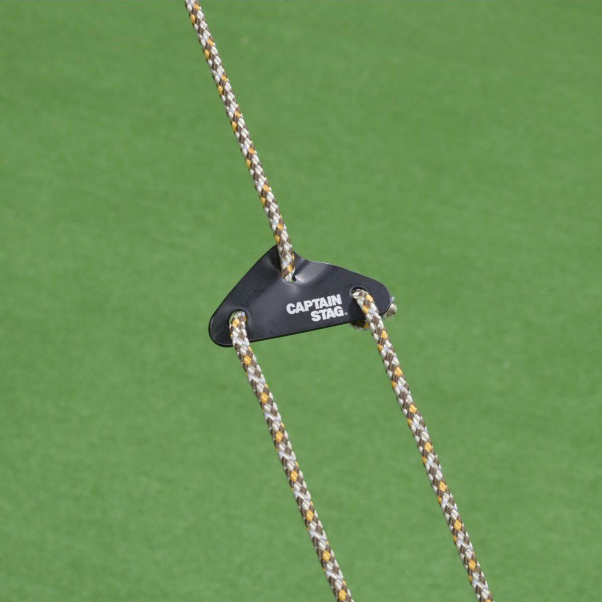 ロープの長さ調整がしやすく、テンションを強くかけられる三角形状のアルミ製自在。