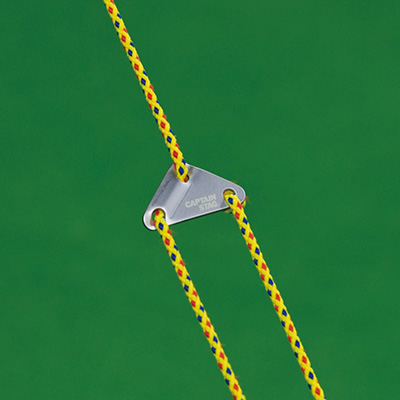 ロープの長さ調整がしやすく、テンションを強くかけられる三角形状のアルミ製自在。