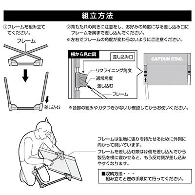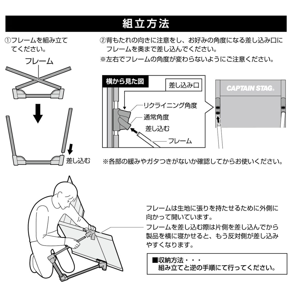 背もたれは2段階でリクライニング可能。フレームを一度引き抜き、もう一つの穴に差し替えることで角度を切り替えられるシンプル構造です。スポーツ観戦など前方をしっかり見たいときは起こした角度に、花火や星空、音楽ステージを楽しむときはゆったり角度にして、シーンに合わせたくつろぎ姿勢がとれます。