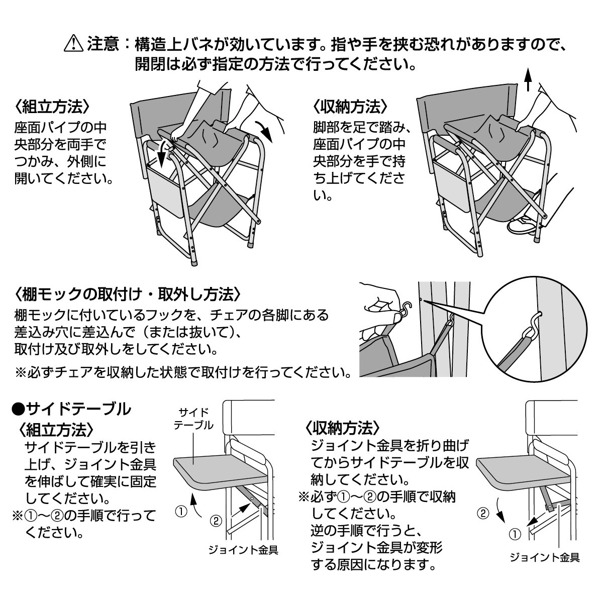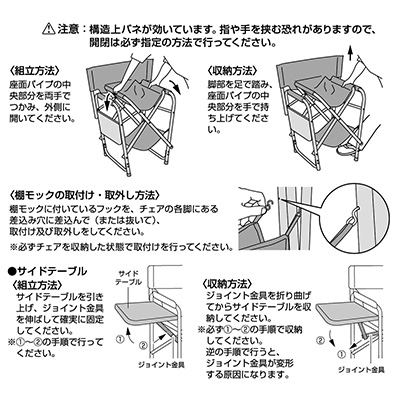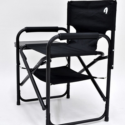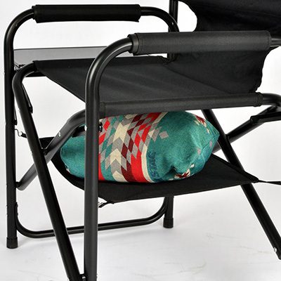 座面下の棚モックと、折りたたみ式サイドテーブルを備えたアルミディレクターチェアです。