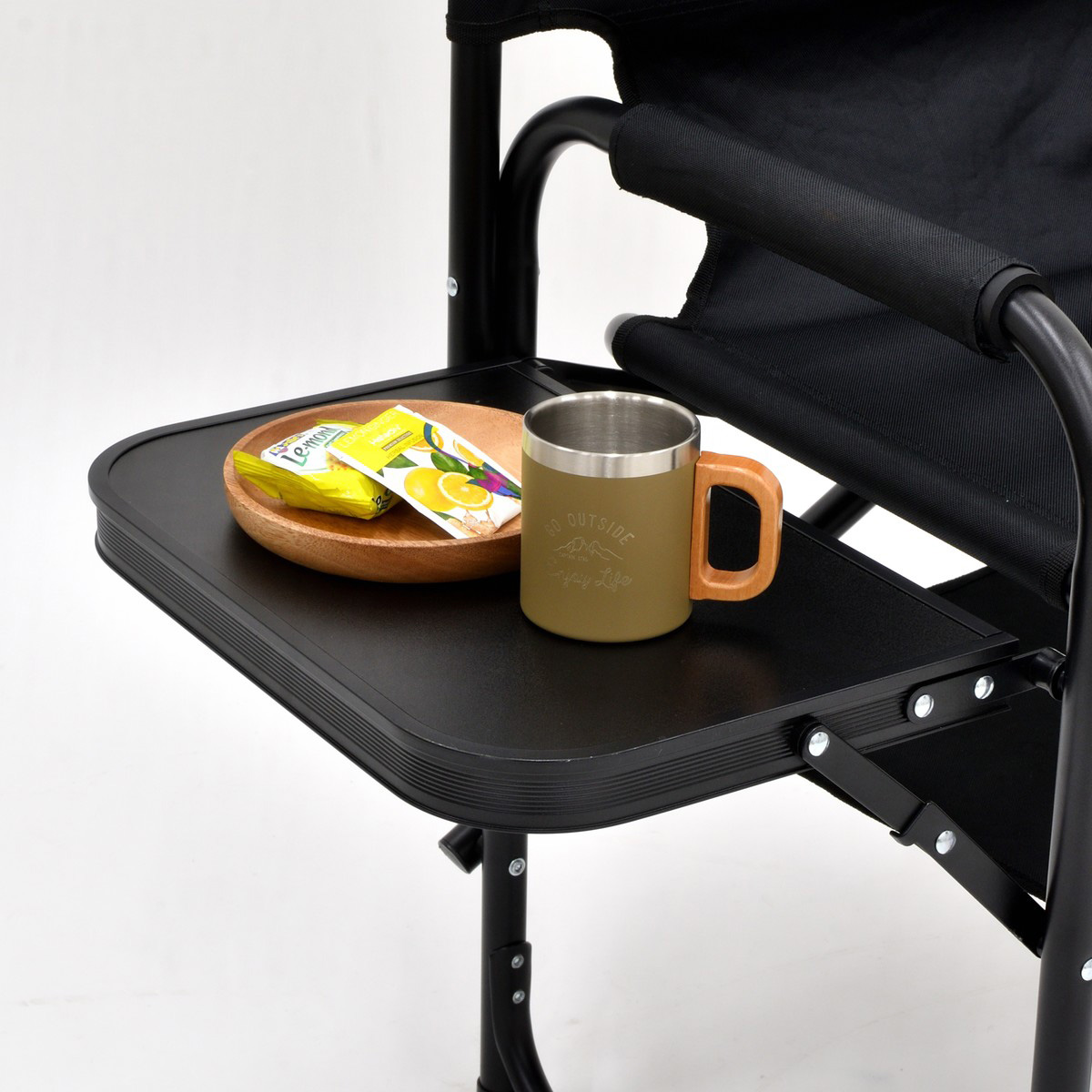 片側にはサイドテーブルを装備。マグカップやスナック、スマホなどを手の届く位置に置けるので、立ち上がる回数を減らしてゆったりくつろげます。使わないときはテーブルを折りたたんでフレームに収まり、持ち運びや収納のじゃまになりません。