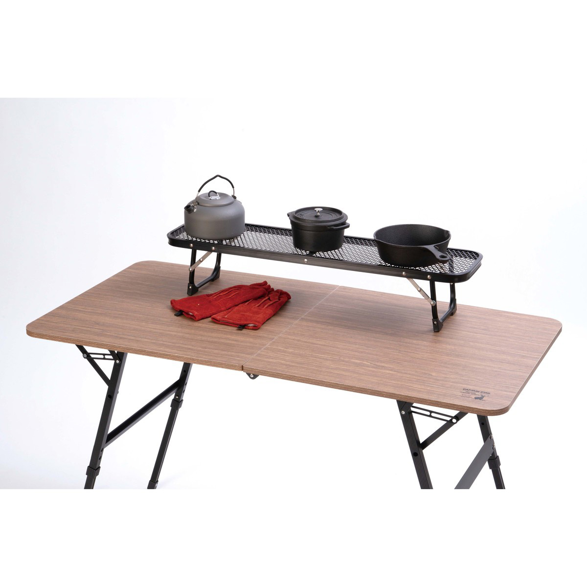 耐熱性の高いスチールメッシュ天板なので、火にかけた鍋やスキレットなどが直接置けます。