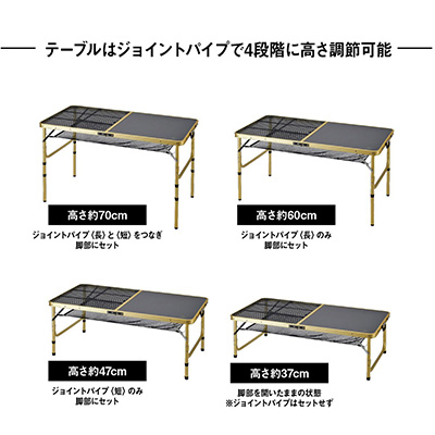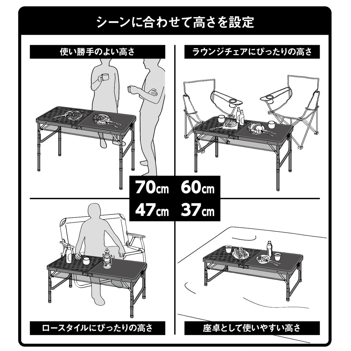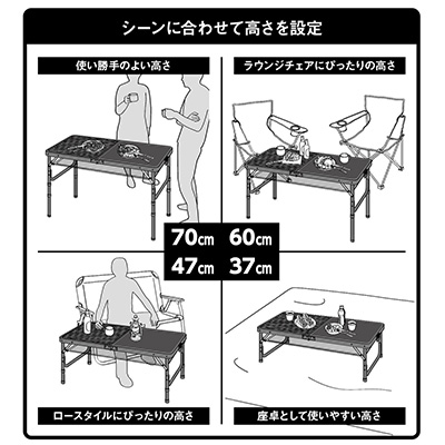 使い勝手のよい70cm、ラウンジチェアにぴったりな60cm、ロースタイルにちょうど良い47cm、座卓として使いやすい37cm。