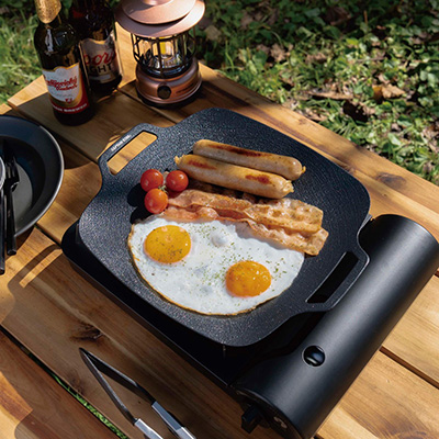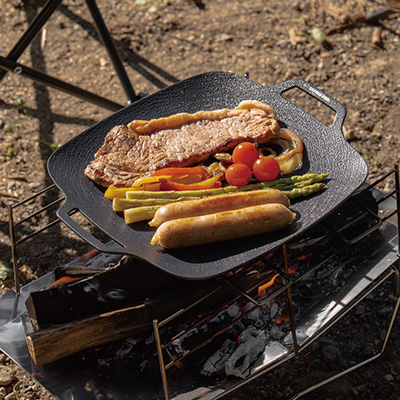 庭BBQからキャンプ、ベランダ調理までこれ一枚。薄くて軽いアルミ鋳物に、ふっ素樹脂塗膜加工と特殊凹凸加工をプラスし、焦げ付きにくくお手入れ簡単。さらに少量の油で調理しやすいので、後片付けもスムーズです。焚き火もIHも対応。
