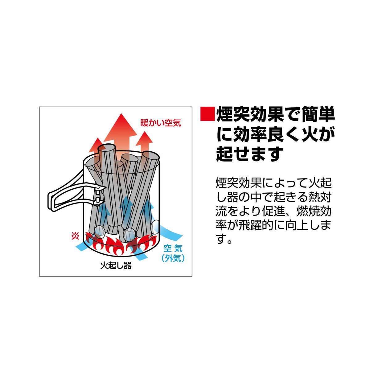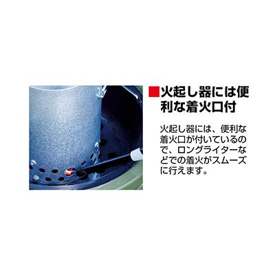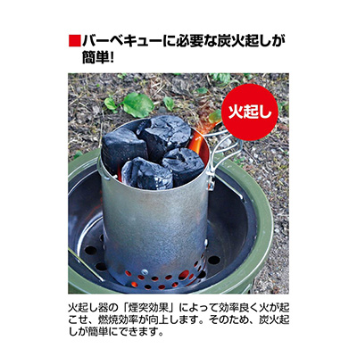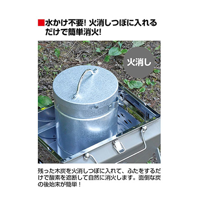 煙突効果で簡単火起し、水かけ不要で自然消化が可能です。