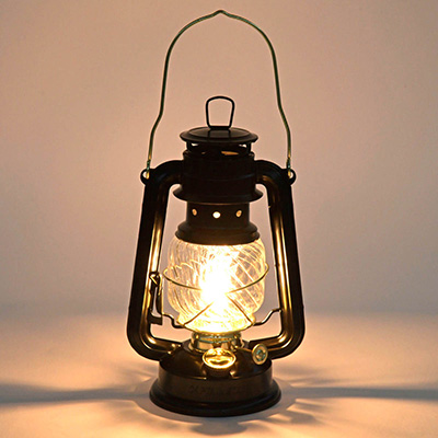50周年特別仕様のブラック&ゴールドのオイルランタンに、光と影が映えるアンティーククリアのホヤをセットアップ。