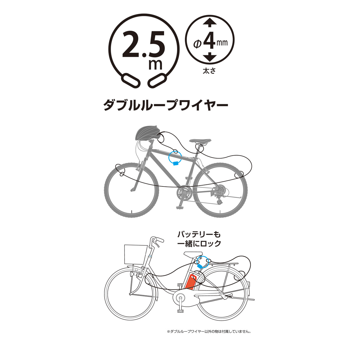 | 製品サイズ(約) | 太さ:φ4mm、ワイヤー:2500mm |